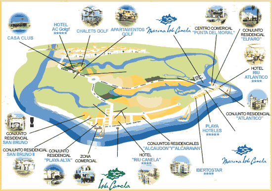 Die Isla Canela ist eine richtige Insel, die durch eine Brücke mit dem Ort Ayamonte verbunden ist. Die Isla Canela verfügt über einen mehr als 7 km langen feinen Sandstrand. Im Bereich unserer Anlage „San Bruno“ ist diesem eine Sandbank vorgelagert, die ein geschütztes Baden garantiert. Auf der Insel befindet sich ein 18 Loch Golfplatz sowie eine neu errichtete Marina. Nahe der Marina ist auch ein Einkaufszentrum mit Restaurants etc. entstanden. Die Marina befindet sich im Osten der Insel, gegenüber dem Dorf „Punta de Moral“. Hier sind bzw. werden |